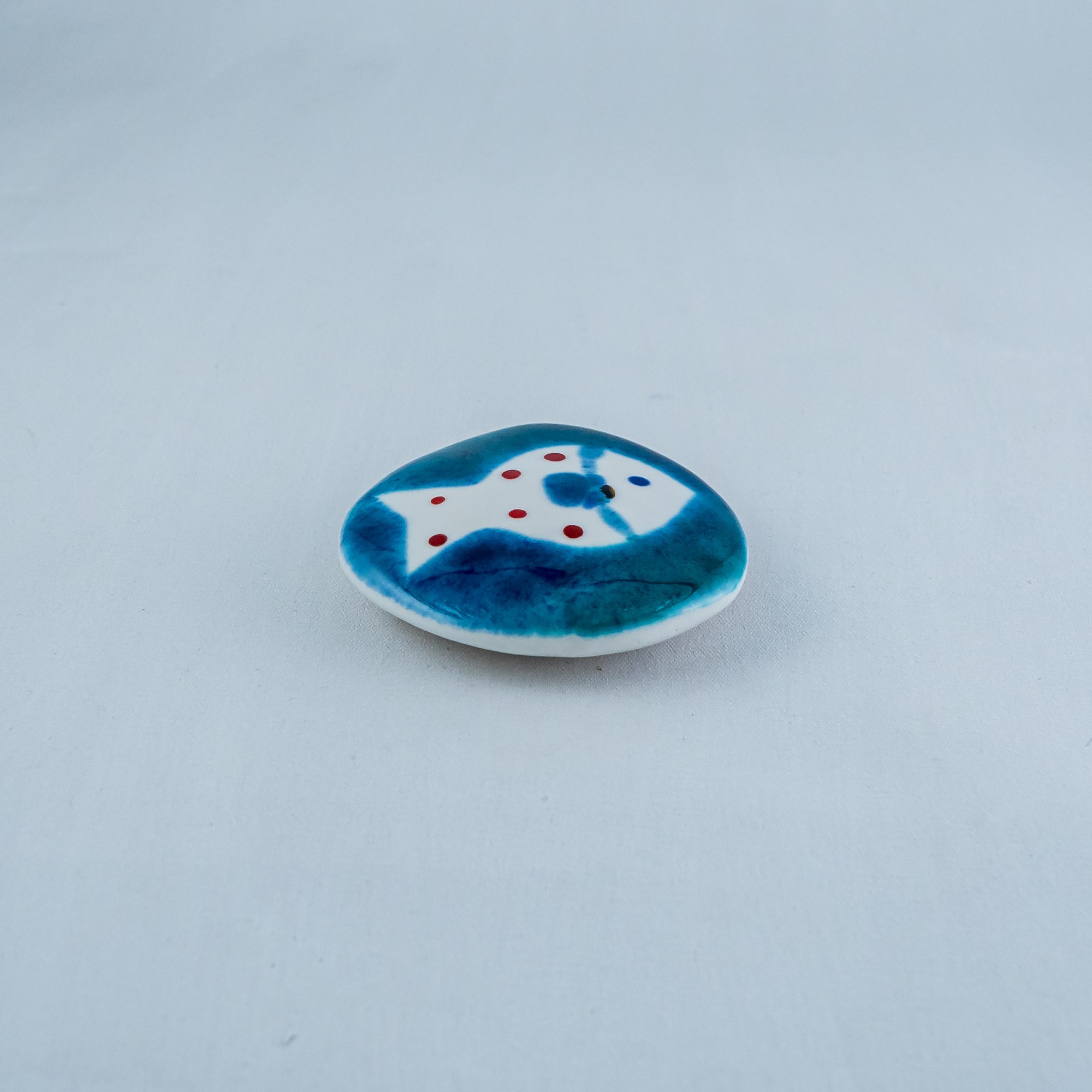Handmade ceramic pebble,coloured with a combination of blue,green and white fine glazes.Ideal choice for decorative purposes.Each piece is truly unique,as it is shaped and painted exclusively by hand. A large variety of colour combinations,sizes and designs offers multiple options for the decoration of every space you wish.