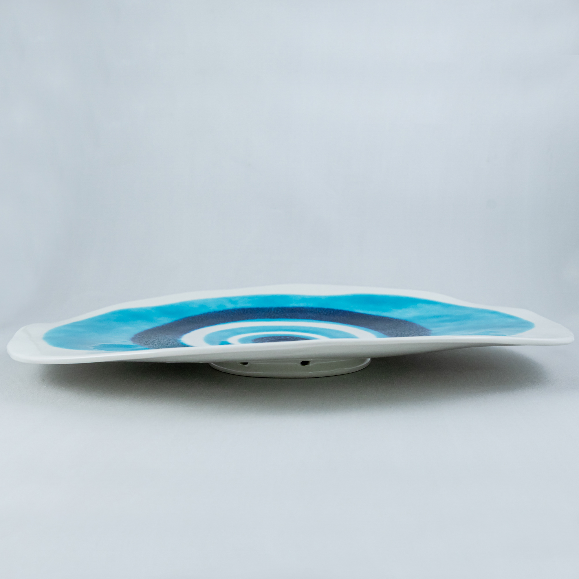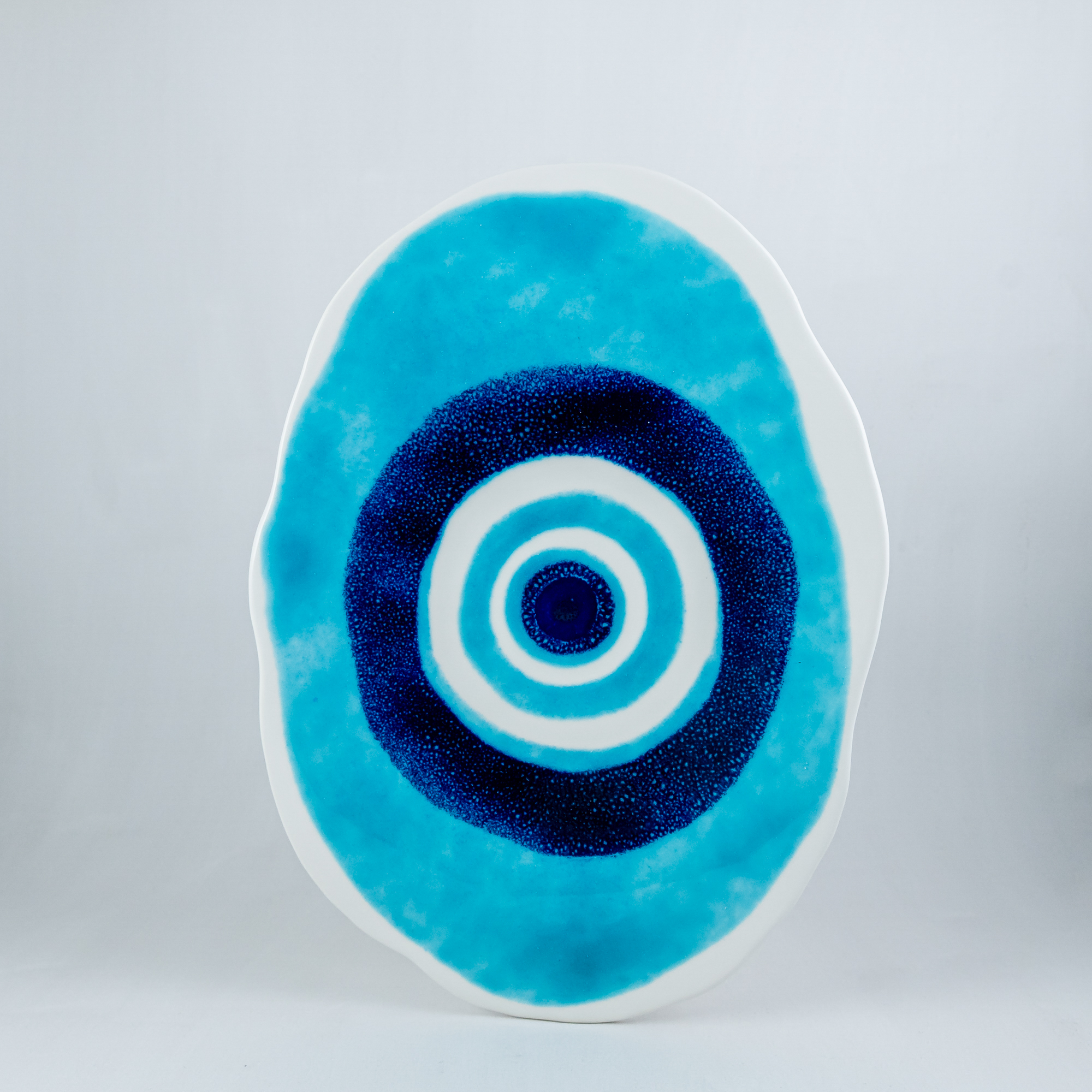 Handmade ceramic platter, coloured with a combination of white,turquoise and blue fine glazes.Ideal choice for everyday use, as well as for decorative purposes.A large variety of sizes, designs and colours offers a lot of options to the creation of your own wall/table plates set.