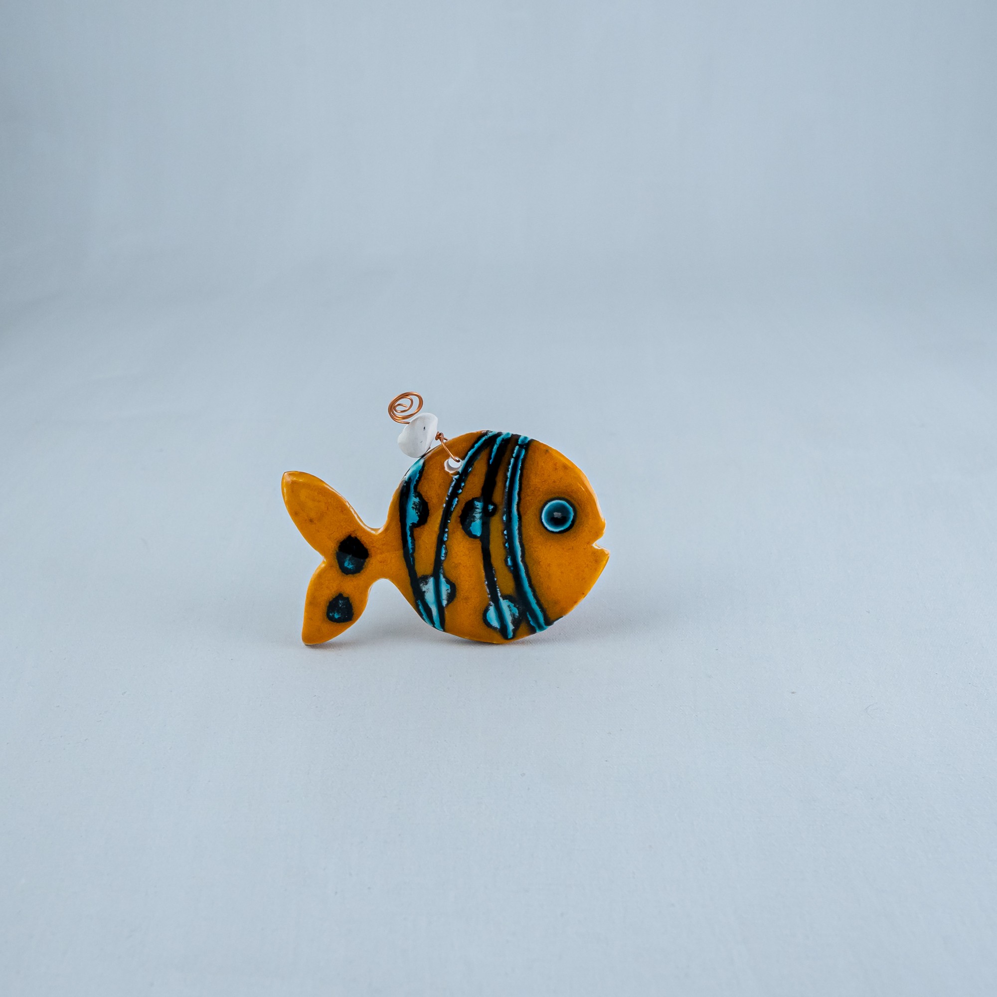 Handmade ceramic fish with a copper wire.It is coloured with a combination of orange and green fine glazes.Perfect choice for wall decoration.