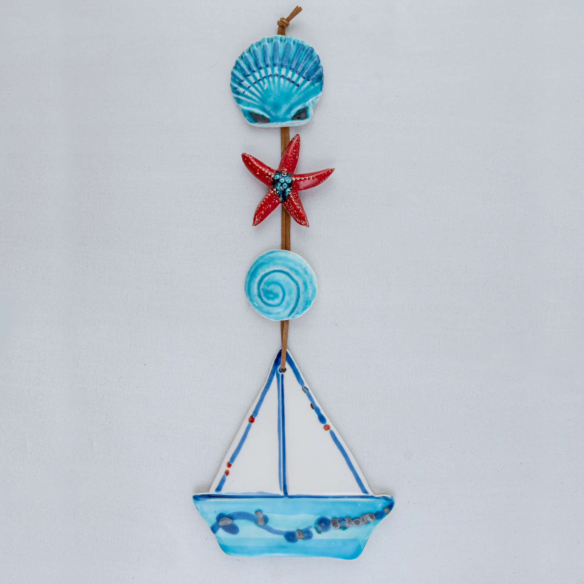 Handmade ceramic garland boat with a leather cord.It is coloured with a combination of turquoise and red fine glazes.Perfect choice for wall decoration.