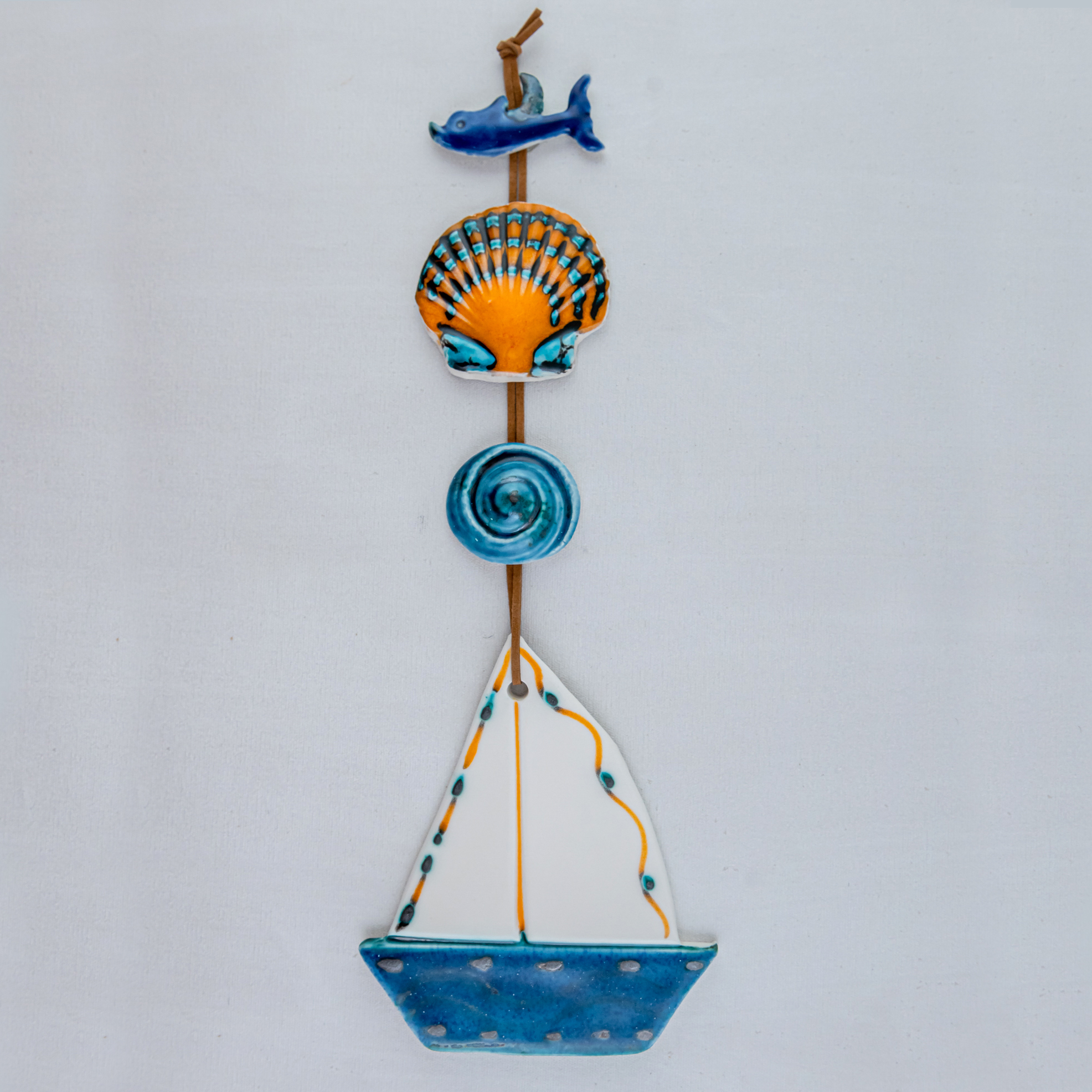 Handmade ceramic garland boat with a leather cord.It is coloured with a combination of blue,orange and white fine glazes.Perfect choice for wall decoration.