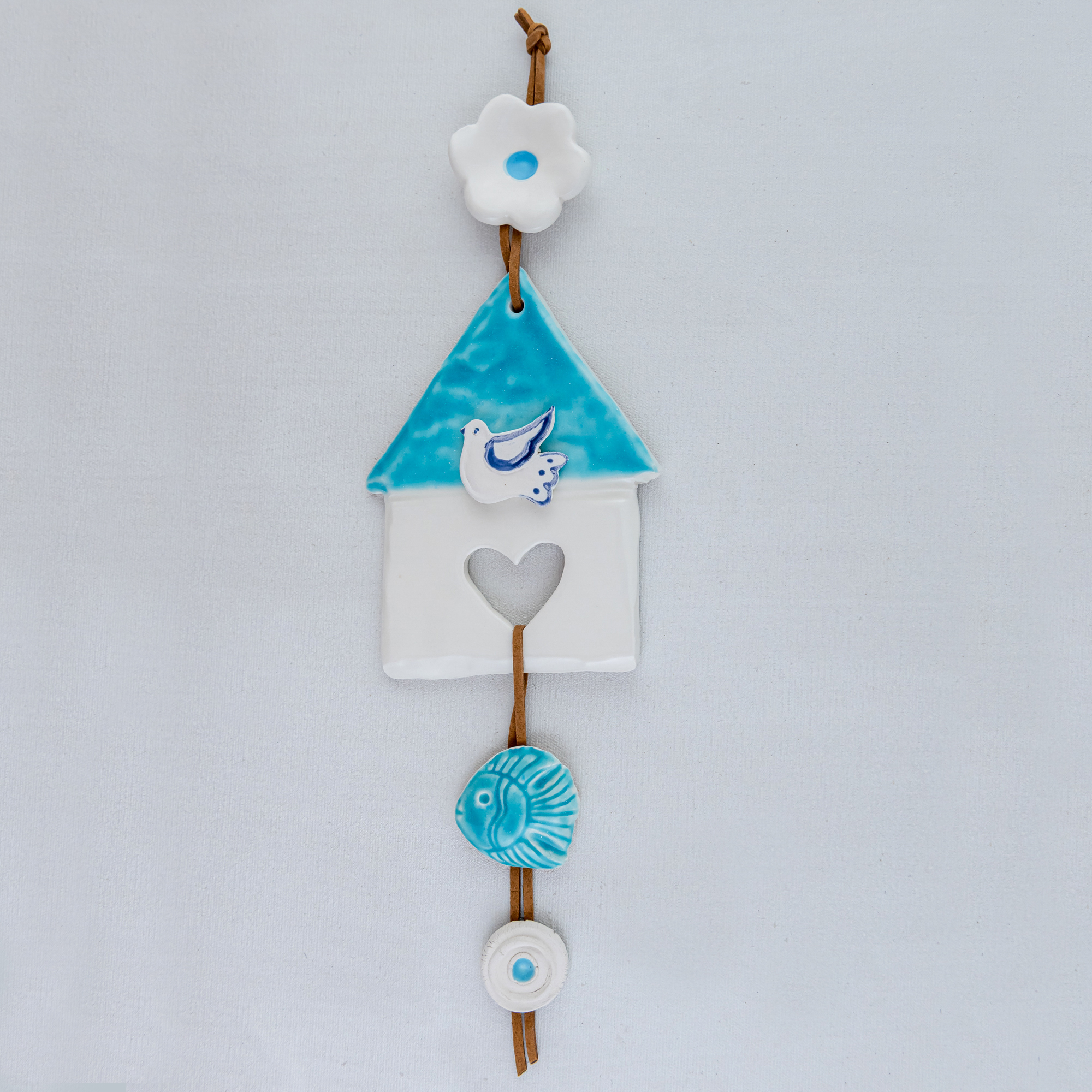 Handmade ceramic garland house,coloured with a combination of turquoise and white fine glazes.Perfect choice for wall or table decoration.