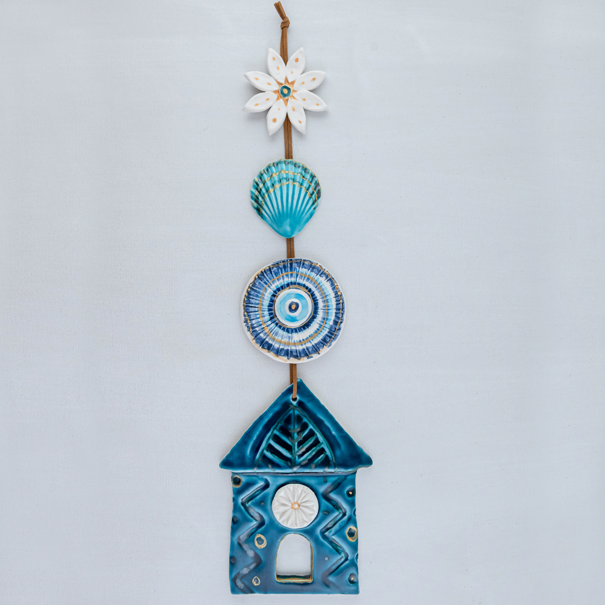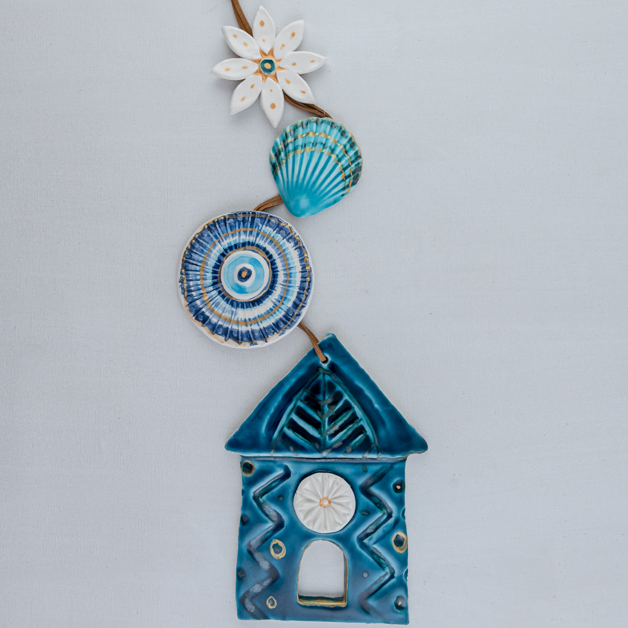 Handmade ceramic garland house,coloured with a combination of blue,green,turquoise and white fine glazes.Perfect choice for wall decoration.