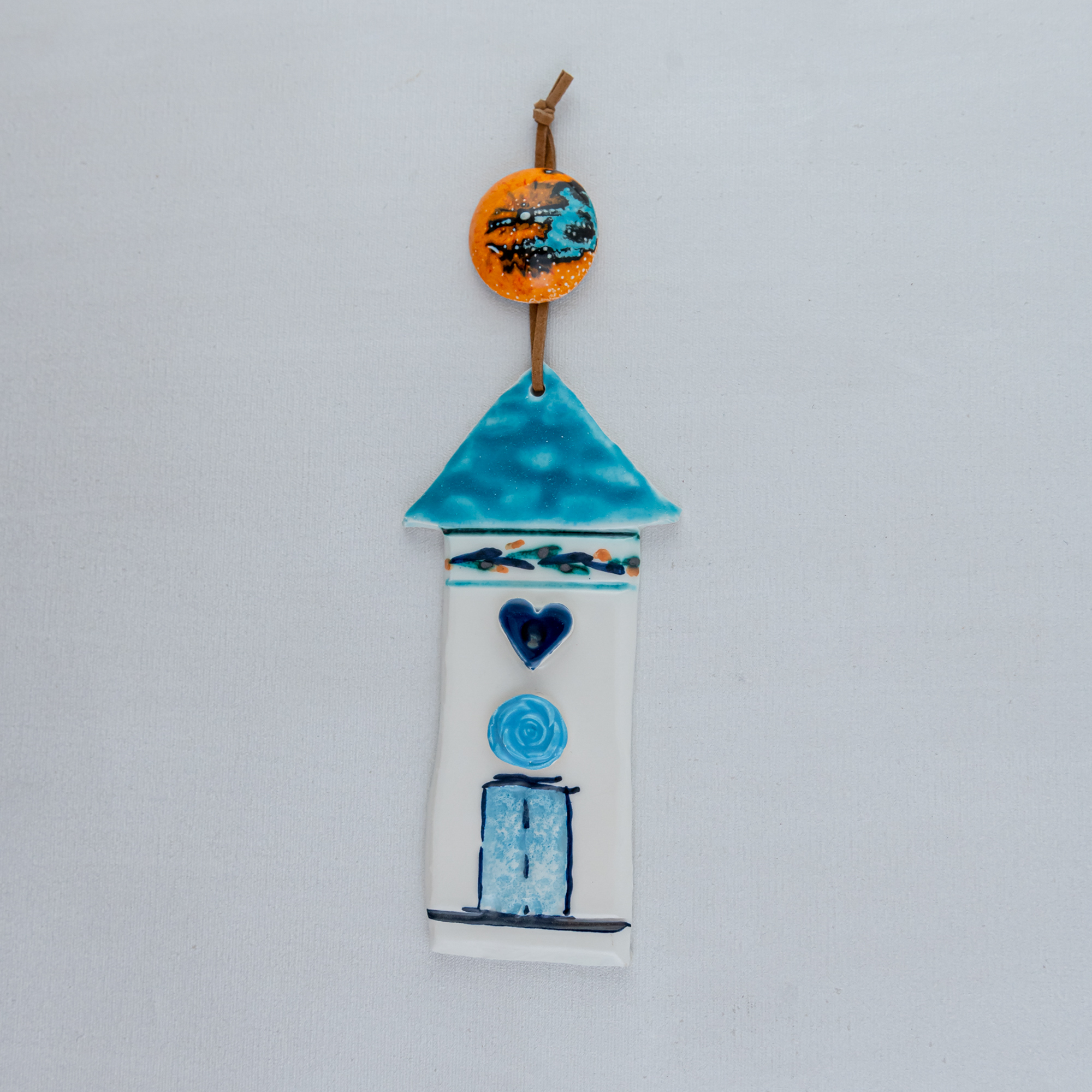 Handmade ceramic house,coloured with a combination of turquoise,white and orange fine glazes.Perfect choice for wall or table decoration.