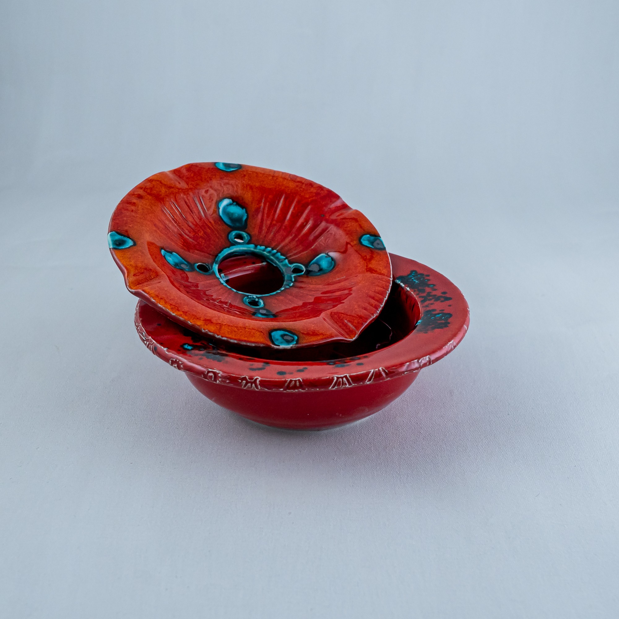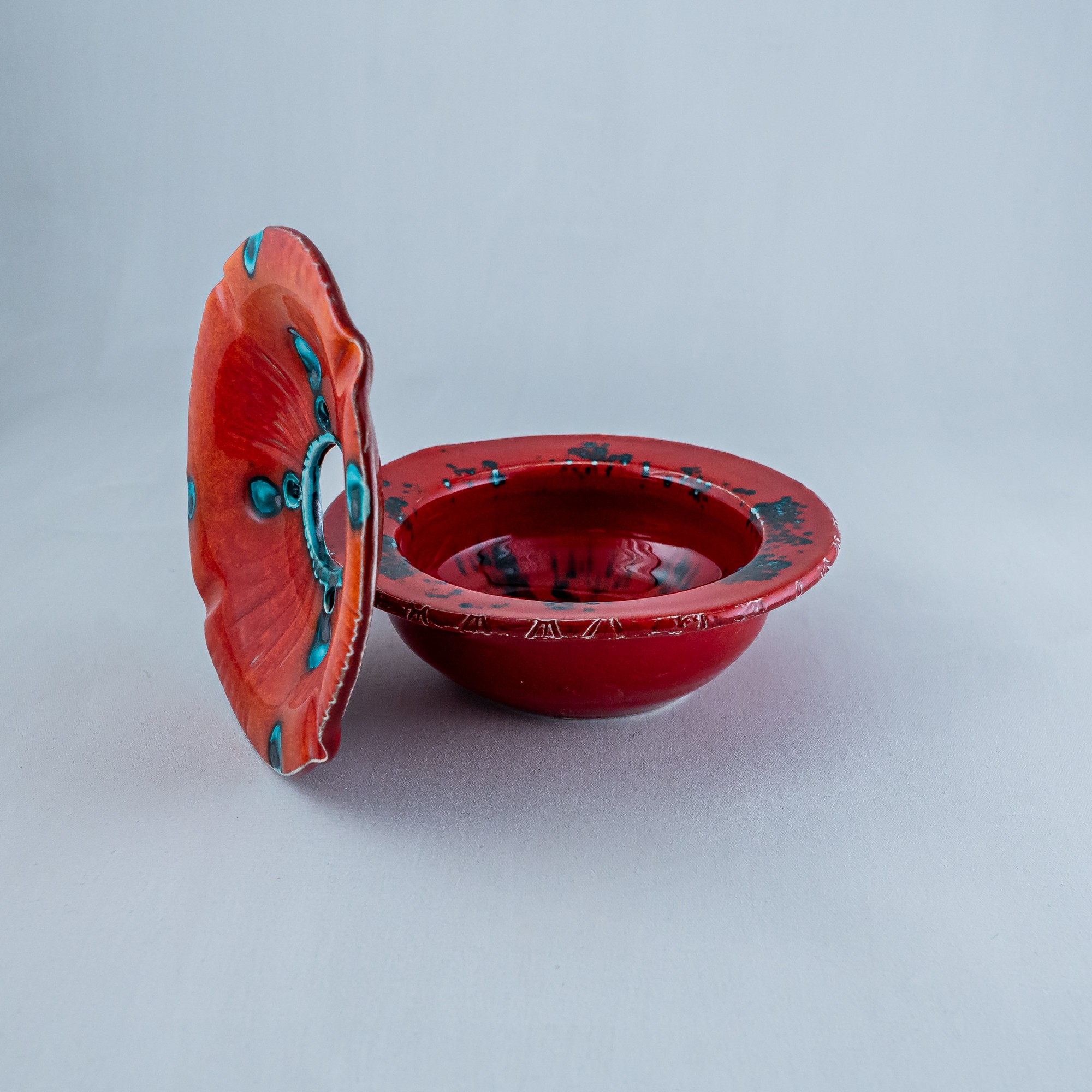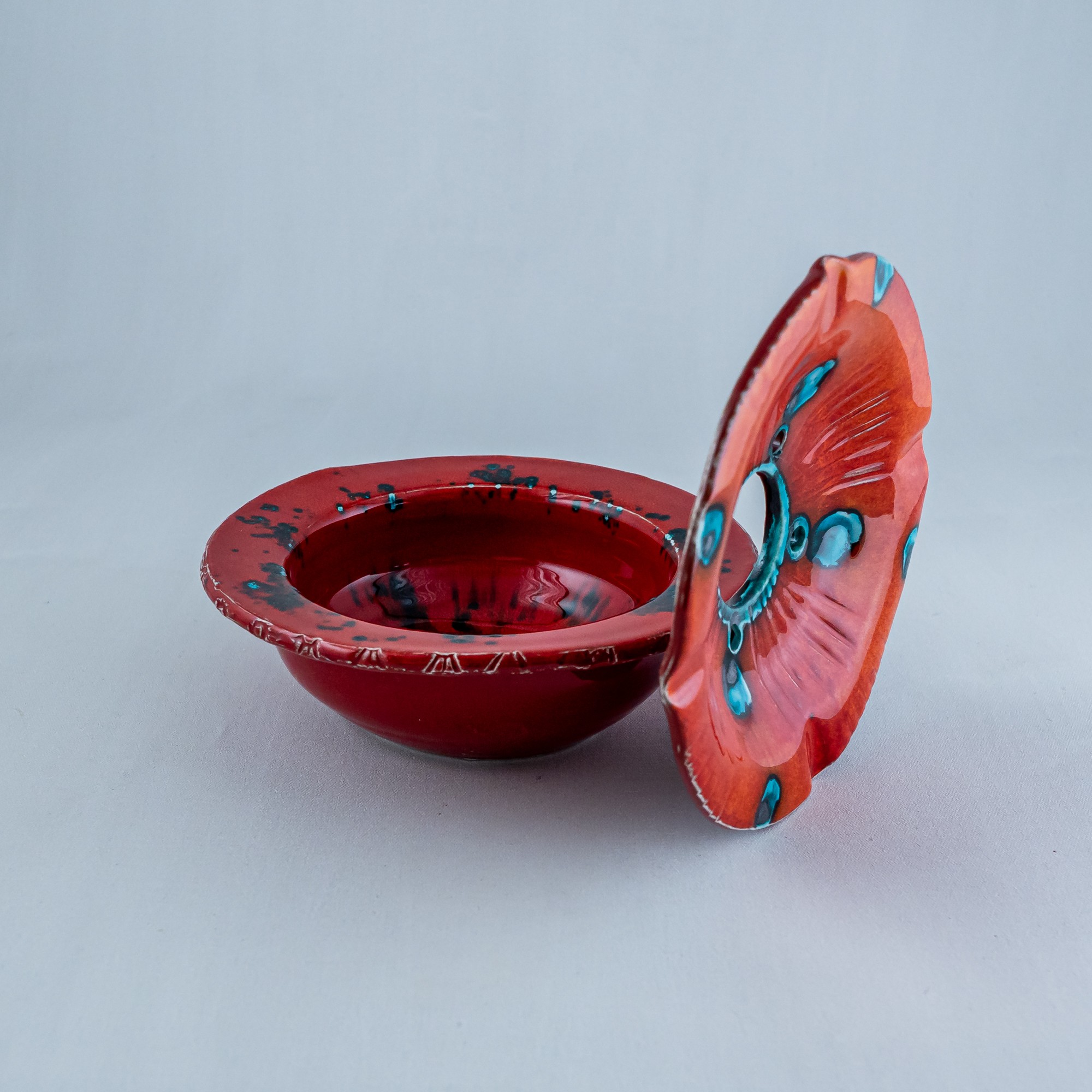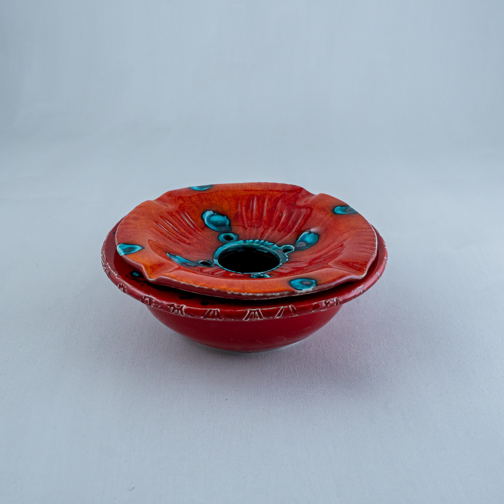 Handmade ceramic windproof ashtray,coloured with a combination of red,orange and green fine glazes.Ideal choice for everyday use,as well as for decorative purposes.Each piece is truly unique,as it is shaped and painted exclusively by hand.Perfect choice for a special gift.