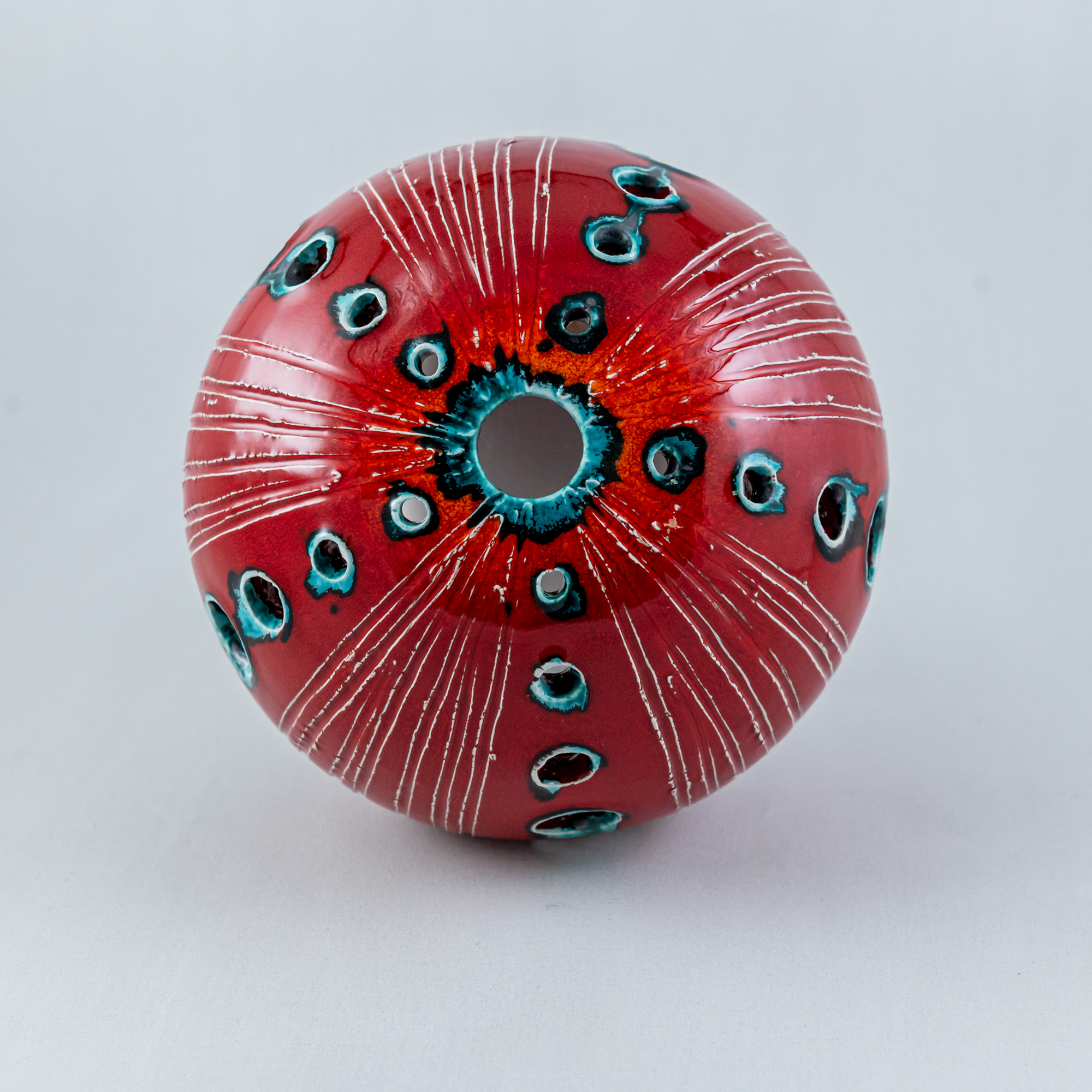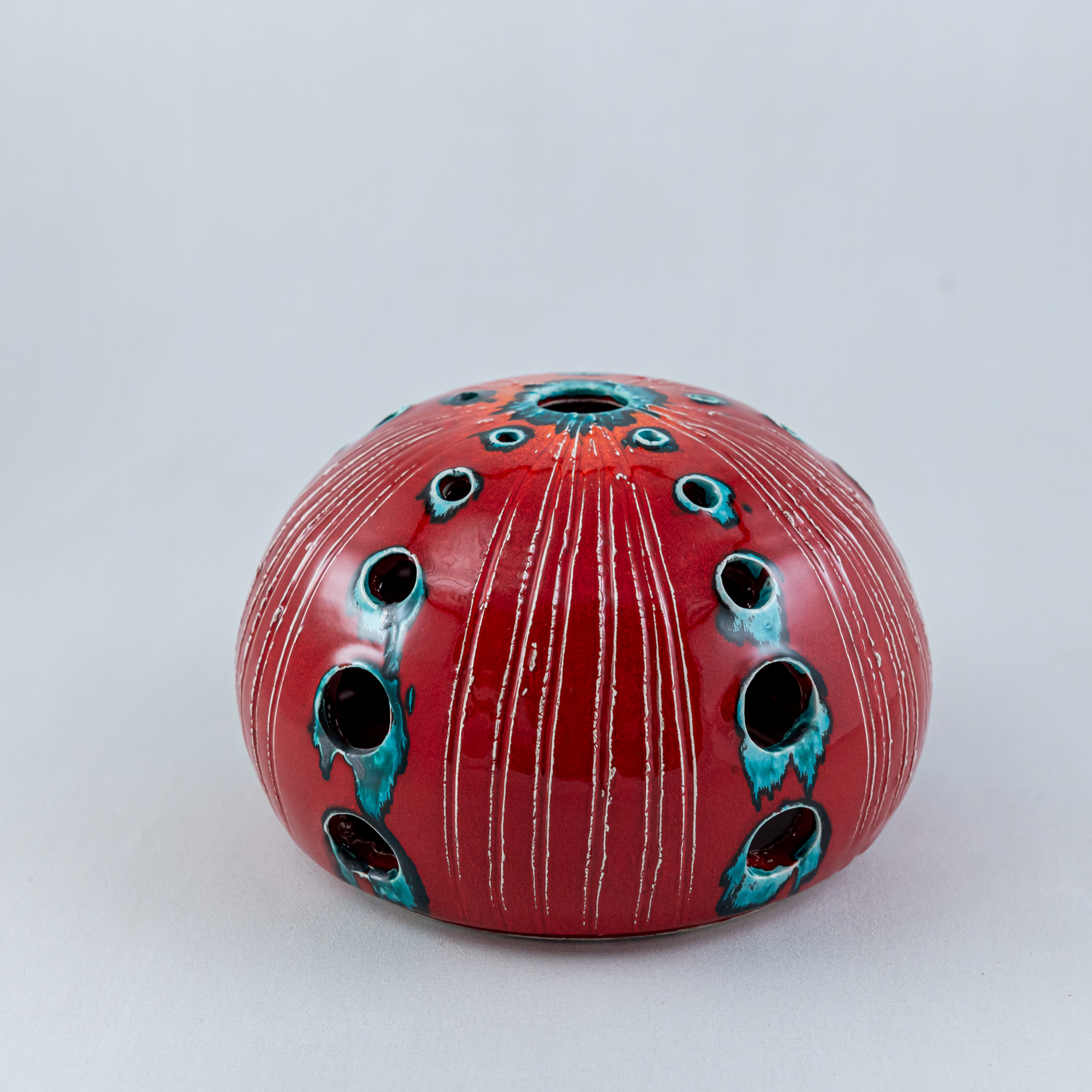 Handmade ceramic sea urchin for decorative purposes.It is coloured with a combination of red and green fine glazes.Perfect choice for wall or table decoration.In combination with a light bulb for the wall or a candle for the table, it gives you the choice to use it like a lighting.