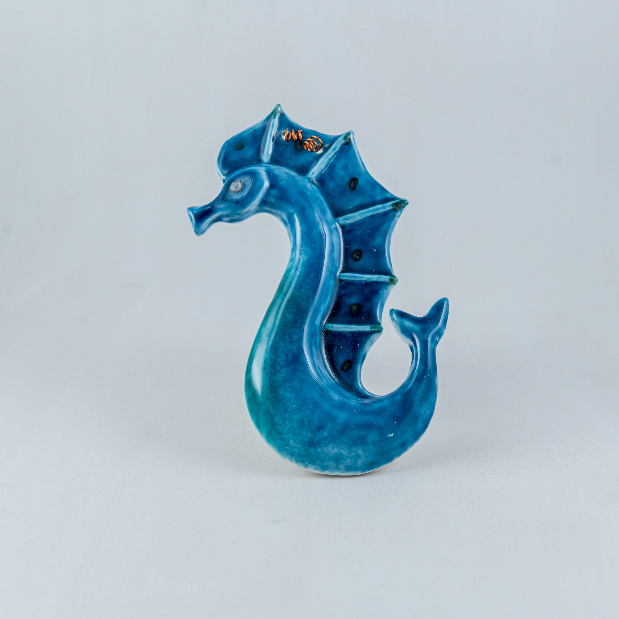 Handmade ceramic seahorse,coloured with a combination of blue and green fine glazes.Perfect choice for wall decoration.