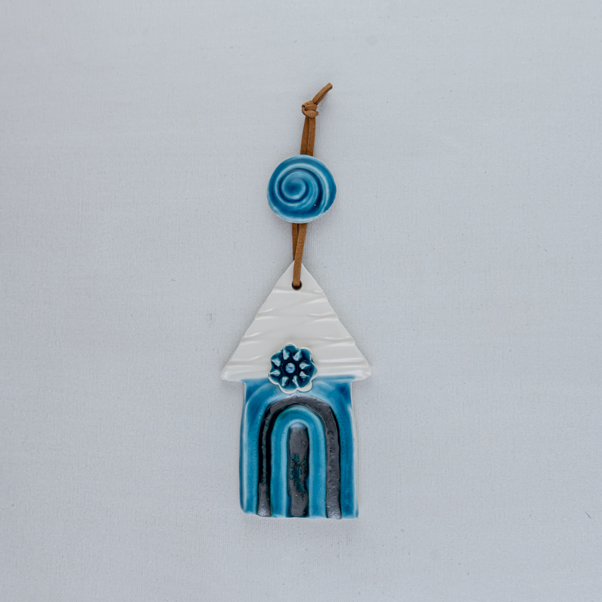 Handmade ceramic house,coloured with a combination of blue,green and white fine glazes.Perfect choice for wall or table decoration.
